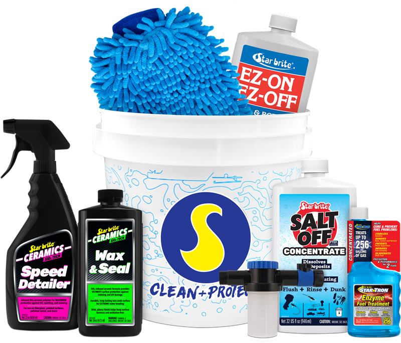 A bucket full of cleaning products and fuel treatment from Starbrite to keep you boat looking and running perfectly.