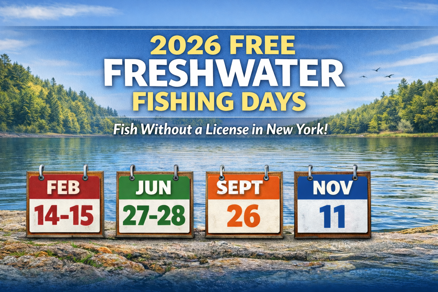 Governor Kathy Hochul and the New York State Department of Environmental Conservation (DEC) have announced the 2026 Free Freshwater Fishing Days in New York, offering residents and visitors six opportunities throughout the year to fish freshwater without the need for a fishing license. The freshwater fishing license requirement will be waived on February 14–15, June 27–28, September 26 (National Hunting and Fishing Day), and November 11 (Veterans Day).