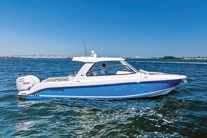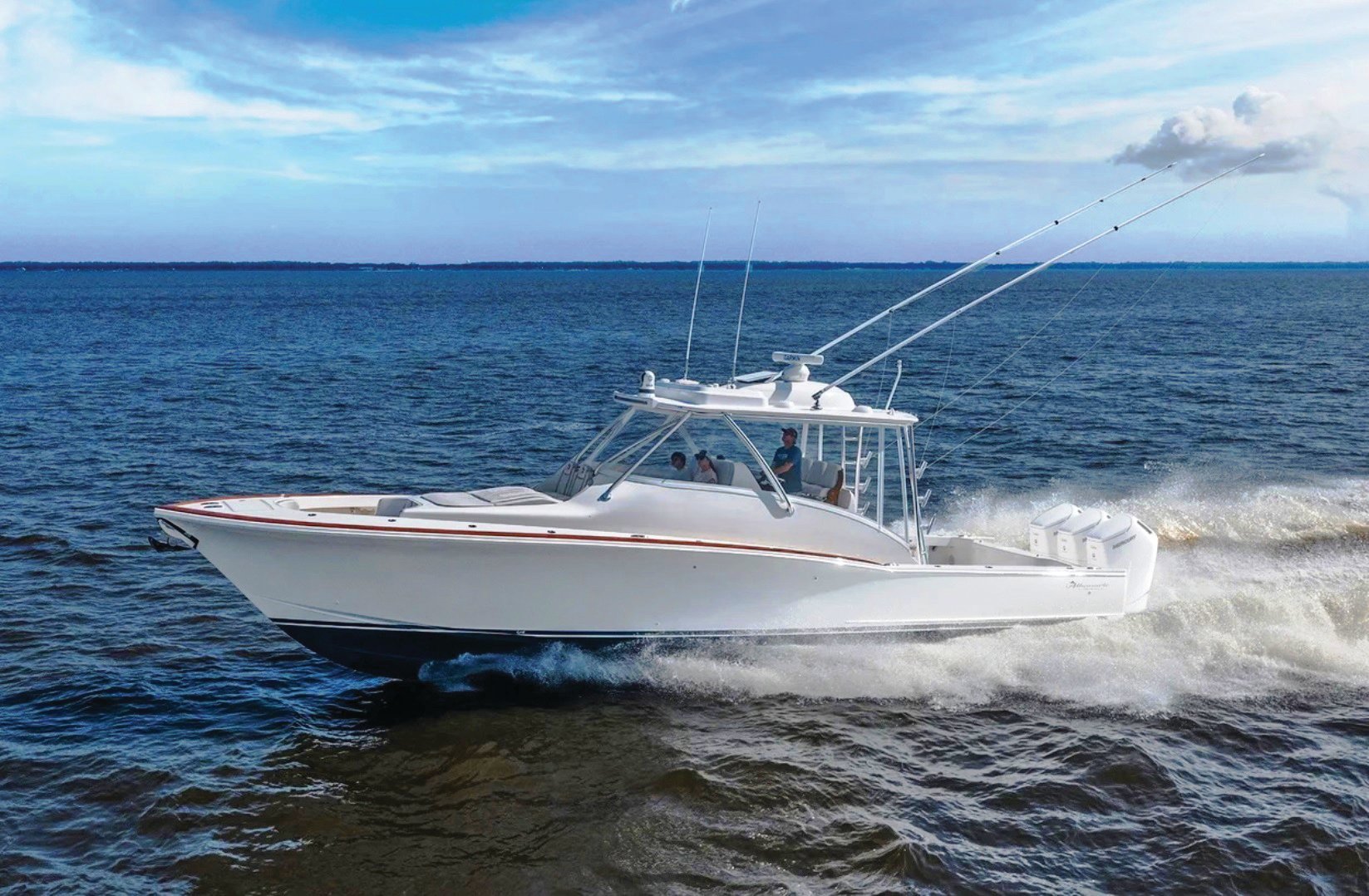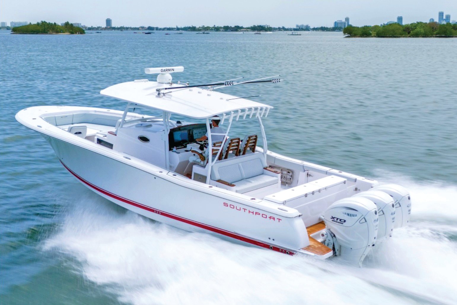 Although there’s reliable scuttlebutt that Southport is ready to introduce a new 42 DC in the next year or so, Southport’s latest introduction is their flagship 38FE, which was introduced mid-season in 2024. Her overall length is listed as 37 feet, 6 inches, with an overwide 13-foot beam. Her hull features a sharp deep-vee angle in the bow that tapers back to 20 degrees of deadrise at the transom. Her dry weight outfitted with a pair of Yamaha F450 XTO V-8 outboards is 18,000 pounds with a draft of 25 inches (engine drives up).