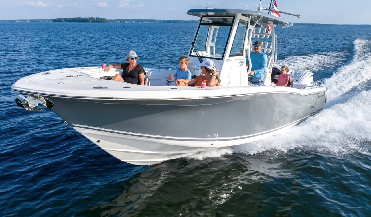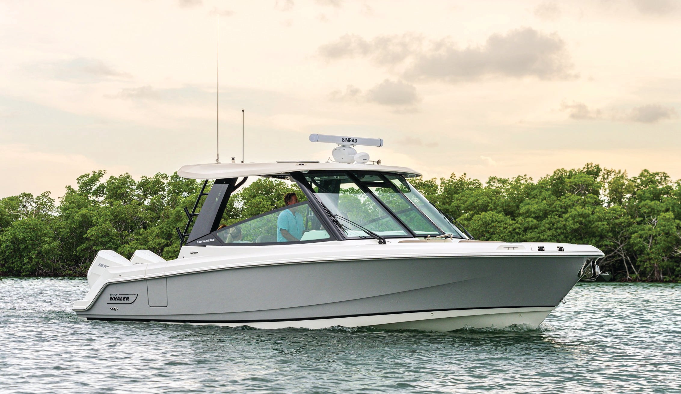 Built on Boston Whaler’s legacy of durability, safety and performance, the 330 offers a number of advantages, including versatility: The 330 dual-console layout provides ample enhanced seating and storage, a customizable cockpit area with fishing and entertaining amenities and the flexibility to transition from a full day on the water to a dinner outing. The 330 offers weather protection with optional full height glass or standard half glass windshield, along with a range of luxurious features, including plush seating, a spacious cockpit, and a well-appointed portside cabin with head. Optional amenities like a grill, refrigerator, and sunshades enhance the onboard experience.