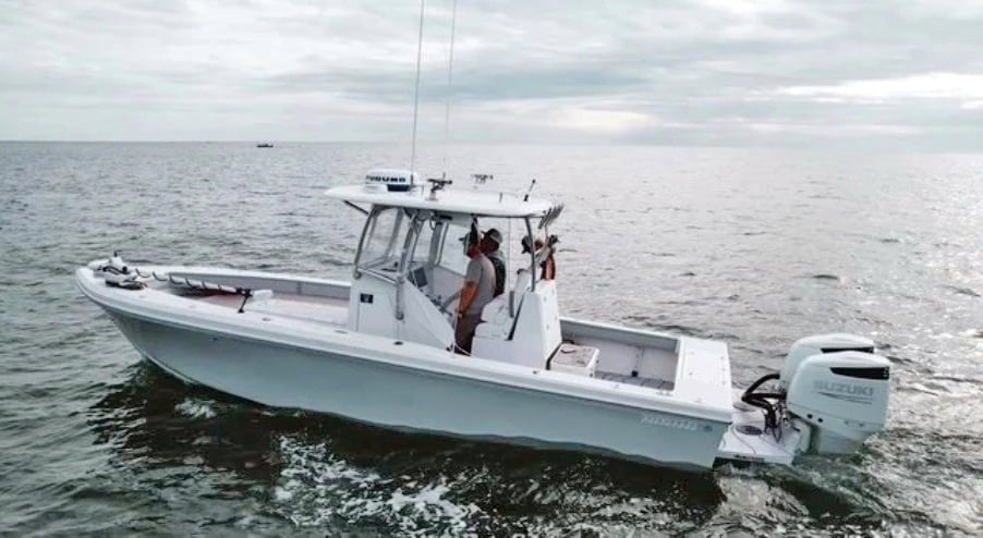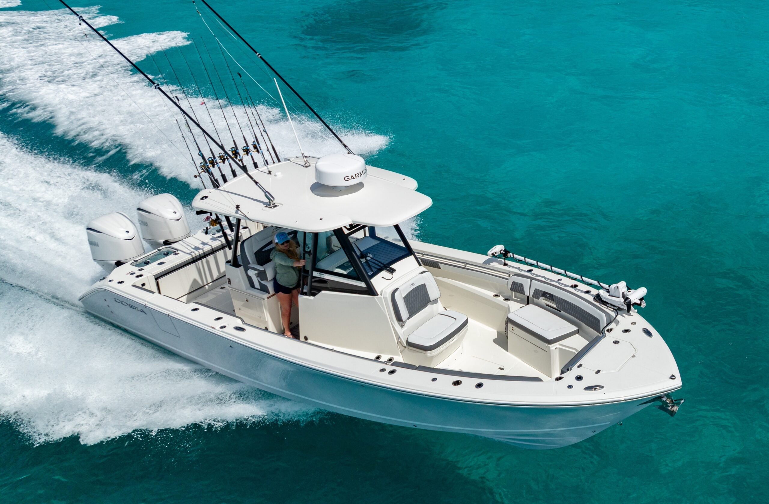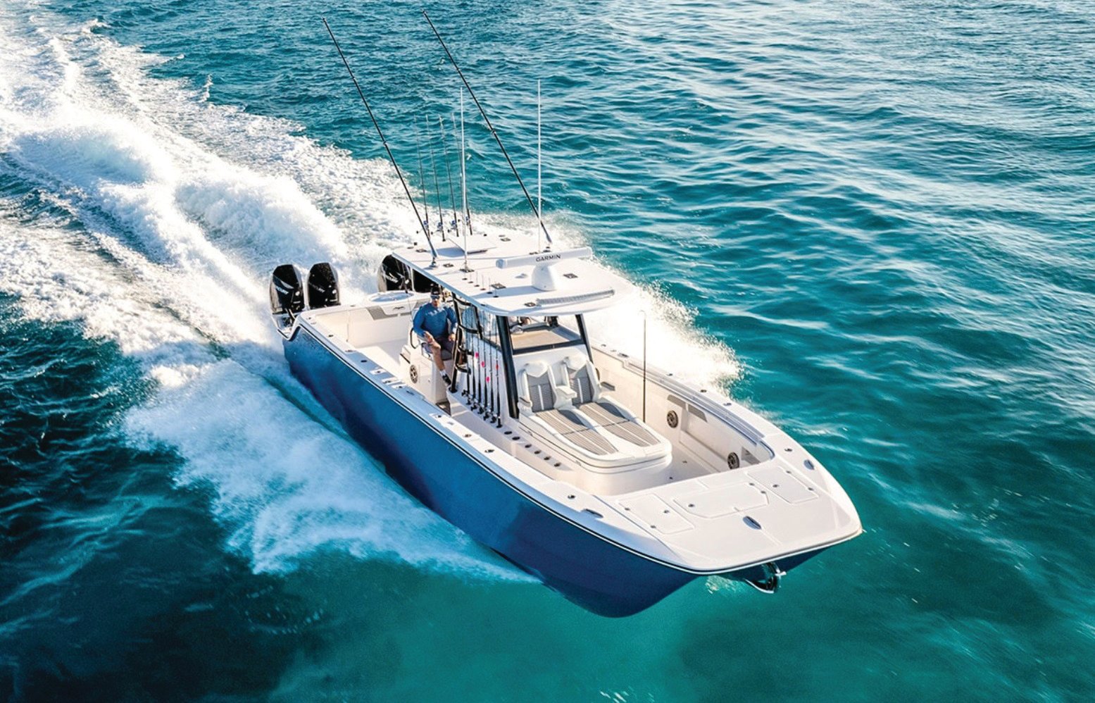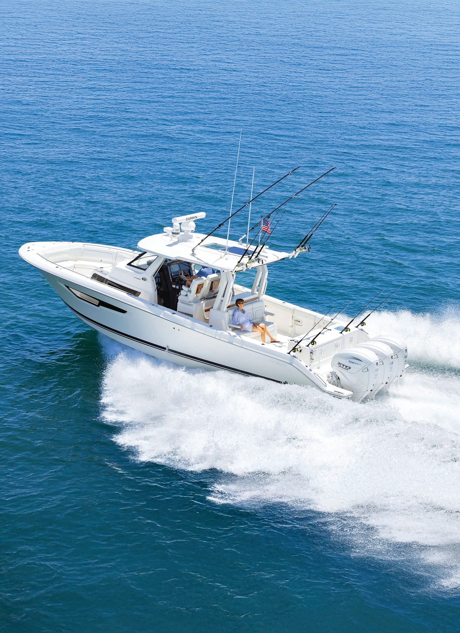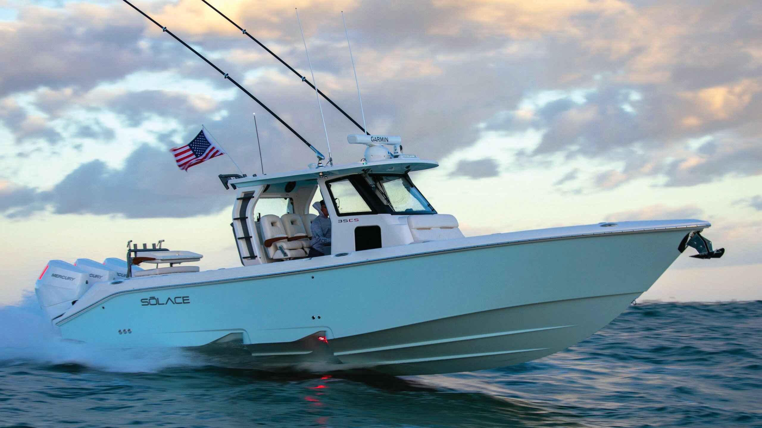 The latest addition to the Solace center console line, the 35CS, is a perfect balance of cutting edge technology, timeless design and unparalleled craftsmanship. This newbie features a dual-step performance hull that provides a smooth, dry ride with precision handling at exceptional speeds. With enhanced fuel efficiency, you can go further and stay longer, all while enjoying the seamless functionality, comfort and safety of the new model. The 35CS measures 35 feet, 4 inches length overall with a 10-foot, 11-inch beam. She features a 47-degree deadrise angle at the bow that tapers back to 22 degrees aft. Her fuel capacity is 435 gallons, with a 34-gallon freshwater capacity and a 20-gallon holding tank for the marine head. The 35 CS offers a pair of insulated fishboxes at 40 and 50 gallons each.