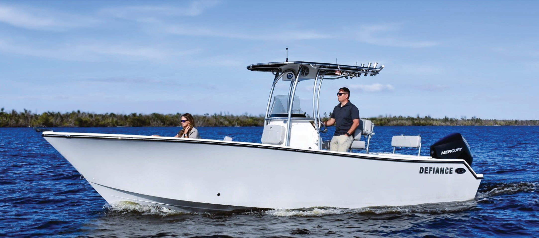 The distinctive feature of the Defiant center console series is the wraparound non-skid deck that facilitates easy boarding, installation of flush mount rod holders, pop-up cleats and self-bailing cockpits. Models 21 feet and larger have a large step down area under the console that provides room for storage and an optional porta-pottie or marine head. The Patriot and Voyager Center Cabin models combine all the benefits of a center console with the convenience of a full cabin. You can walk and fish around the side decks of the cabin without tripping over elevated steps. Additional weather protection is provided by each of these models giving you the opportunity to cruise, play, or fish longer in comfort and security.
