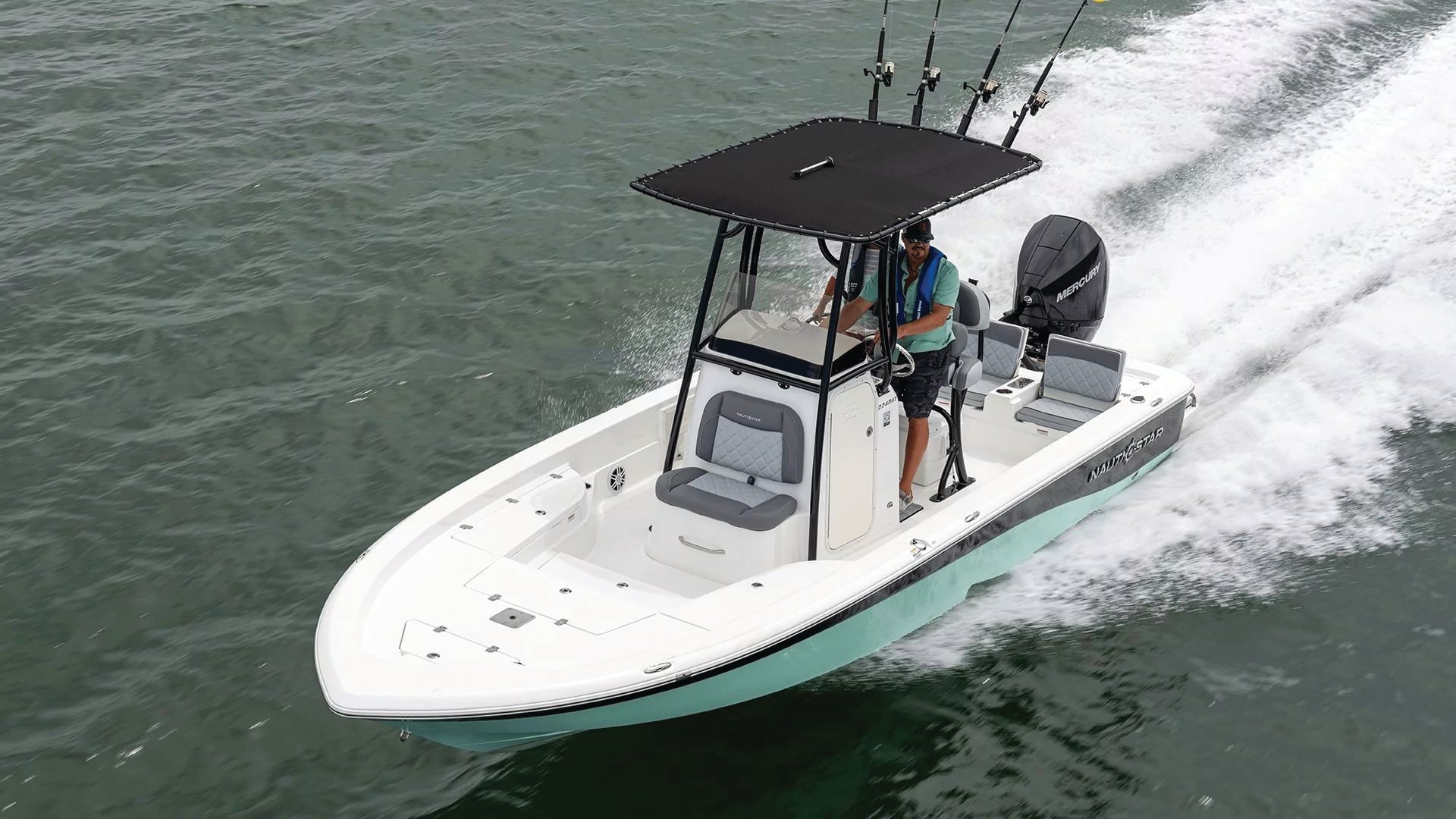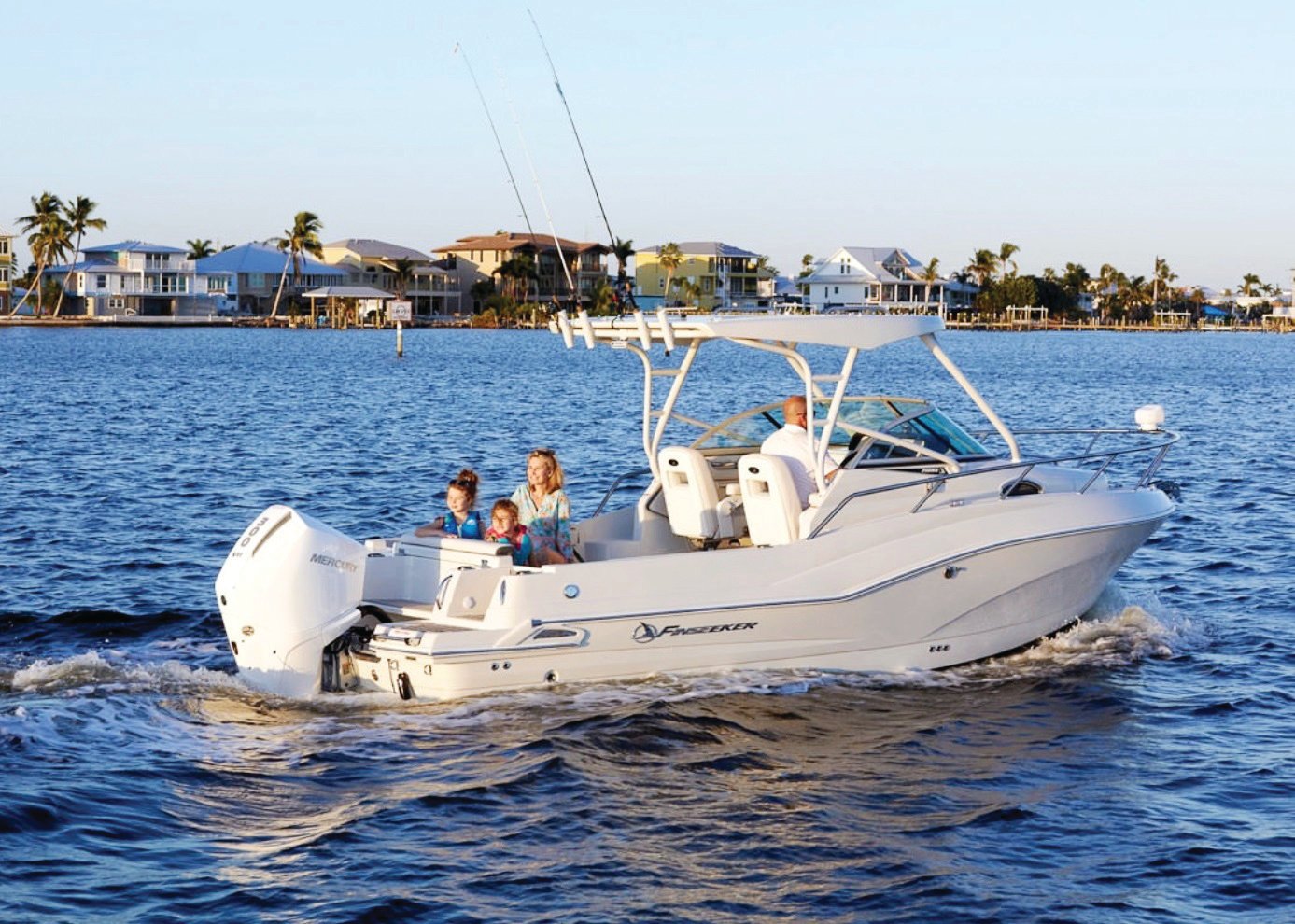 Her notable list of standard features includes outboards from Suzuki, Yamaha, or Mercury engines (up to 250hp), dual 30-gallon aluminum fuel cells (one in each sponson) for a balanced ride; hydraulic steering; on the spacious bow day bed with plush upholstery and backrests; stainless steel cupholders and pull-up cleats; built-in bucket storage compartments; dual 25-gallon aerated livewells; insulated in-deck fish boxes for icing your catch; an integrated T-top with spreader lights, rod holders and grab rails; and more. A Family Terrace Package is available, complete with grill and cutting board, which is perfect for onboard dining and the ultimate catch/clean/cook experience.