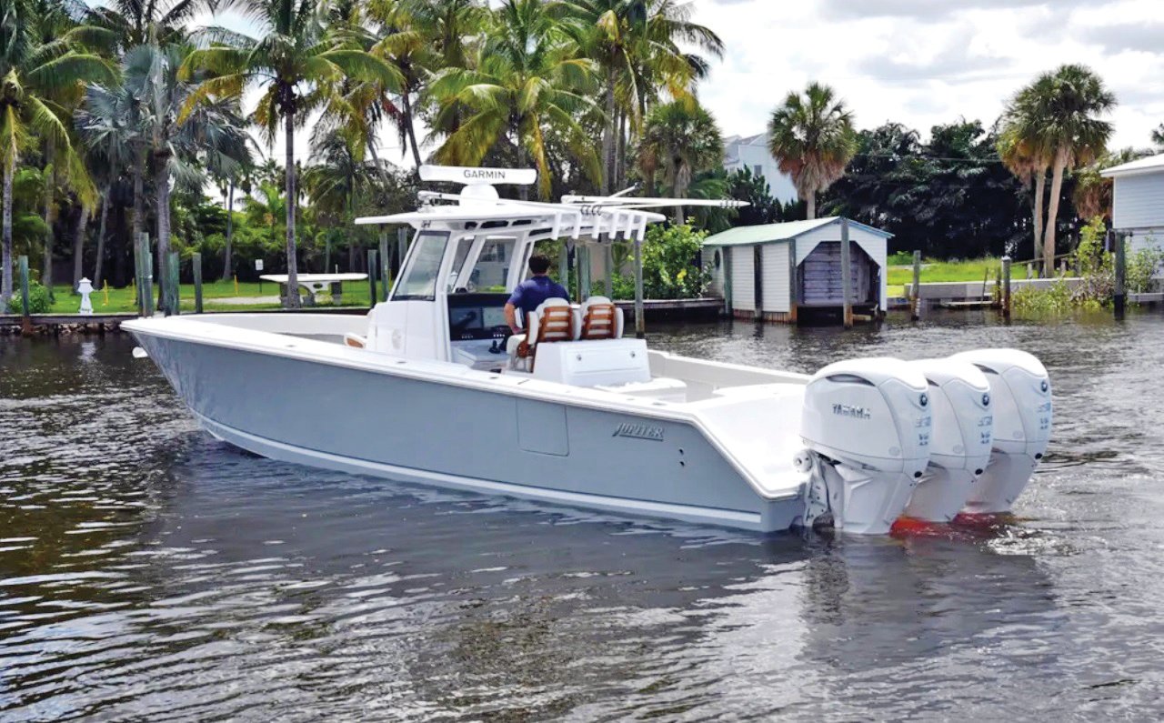 The Jupiter 380 LS is based on an overall length of 38 feet, 2 inches with a svelte 10-foot, 7-inch beam. Her dry weight tips the scales at 11,480 pounds and her draft is 36 inches with the motors down and 24 inches with the motors up. Fuel capacity is 475 gallons, with 50 gallons of freshwater capacity. She’s rated to carry up to 1,275hp on the transom with either twin or triple outboards. Her razor sharp entry angles are 60 degrees forward and 24 degrees aft, so she will tame opposing head seas with a vengeance.