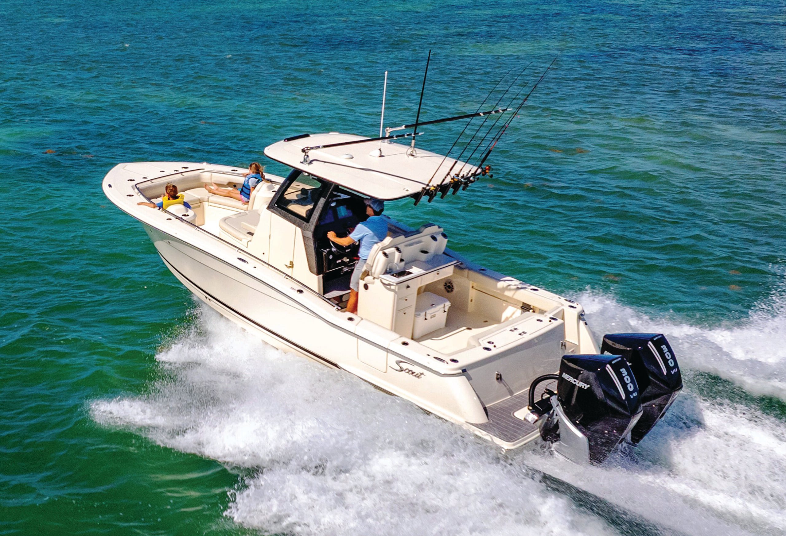The latest introduction from Scout is their 288 LXF. This newbie joins Scout’s most prolific lineup of luxury center consoles which range from 26 to 53 feet, with a total of 10 siblings in the family. Like all Scouts, the new 28 LXF features a graceful raised forward shear line and deep Carolina forefoot to part the seas and the throw spray out and away from the cockpit and its occupants. The full width transom bracket features a fully walkable swim platform area with EVA foam matting, which provides a safe and comfortable footing in all types of sea conditions. The stylish surface makes for easy boarding and traction with bare feet when swimming and doing water sports activities on family getaway days.
