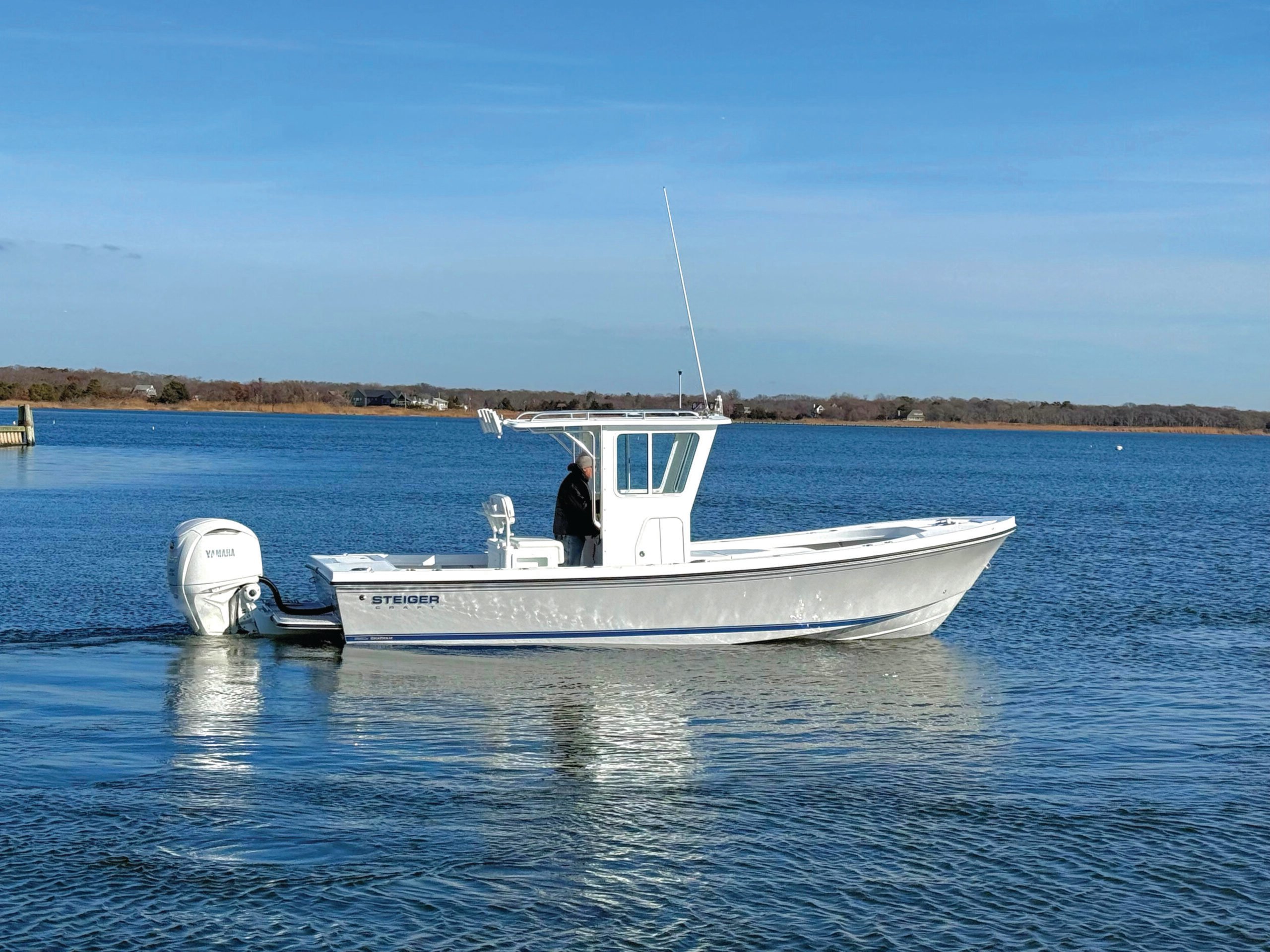 If you are a center console fan but want to maximize your fishing experience, the Steiger 23 and 25 Chatham will hit all of your fishing feature hot buttons. The Chatham layout offers full 360 degrees of unencumbered fishability to the max! One of the outstanding features of all Steiger boats and their local boat builder mindset is their modular flexibility to install exactly what you want, exactly where you want it. You can add or delete features to suite your particular coastal sport fishing needs. The 23 Chatham features a classic notched outboard transom that supports a single XXL 30-inch shaft outboard and she measures 23 feet LOA with an 8-1/2-half foot beam, tipping the scales at a beefy 4,600 pounds. A Yamaha F250 V6 is standard power, but prospective owners can upgrade to the popular F300 for max performance.