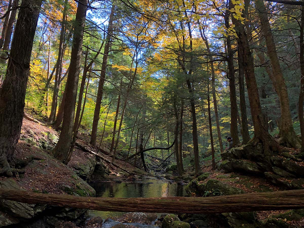 Brook trout need cold, clear water to survive. Unfortunately, human development has destroyed much of their natural habitat. In comparison to the time before European settlement and the industrial age, very few streams and fewer lakes and ponds are now home to the pristine conditions brook trout need to survive. This makes visiting the places that brookies call home all the more special. They tend to be off the beaten path, far from development. Forests with dense canopies, Hemlock trees and thick Mountain Laurel provide shade keeping spring-fed trickles and mountain streams cool. The clear water coursing through the boulders, plunge pools and falls provide the oxygen rich water they thrive in. While there are exceptions, often times the very conditions brook trout need for their existence are the visually dramatic landscapes that hikers are drawn to. The networks of hiking trails throughout the range of the Appalachian foothills often lead along streams that are home to these special fish.
