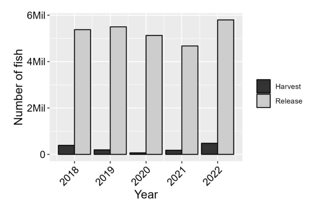 The striped bass fishing during 2022 was very good to excellent throughout Massachusetts, and this resulted in the highest amounts of harvested and released striped bass in recent history (Figure 1). Beginning in early March, smaller holdover bass were available in several areas and smaller migrating bass began arriving on the South Coast by mid-April. By mid-May, larger bass were in Massachusetts waters, feeding on squid, menhaden, seaworms, and silversides. Over the course of the season, two areas were exceptional: Cape Cod Bay and the rips off Monomoy. There were large schools of menhaden from Plymouth to Boston Harbor and big striped bass were feeding on them all summer long. Anglers live-lining menhaden landed and released many bass above 40 inches.