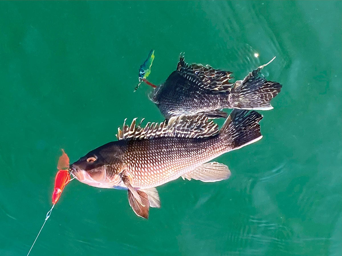 As I have demonstrated firsthand to hundreds of my charter fishing customers, sea bass are suckers for a well-placed jig in the strike zone. Bucktails, diamond jigs, other metal sand eel imitations, and soft plastic leadheads all will work at a given moment, relevant to water depth, wave action and current flow conditions. In the month of November, the majority of black sea bass are migrating out of inshore coastal areas and can usually be found on wrecks situated in 120- to 180-foot depths as they trek offshore to the continental shelf for their winter layover. At this time, precise positioning over these wrecks is not essential and I’ve found that being “in the neighborhood” anywhere from 50 to 100 feet away from the structure will get you a decent amount of action.