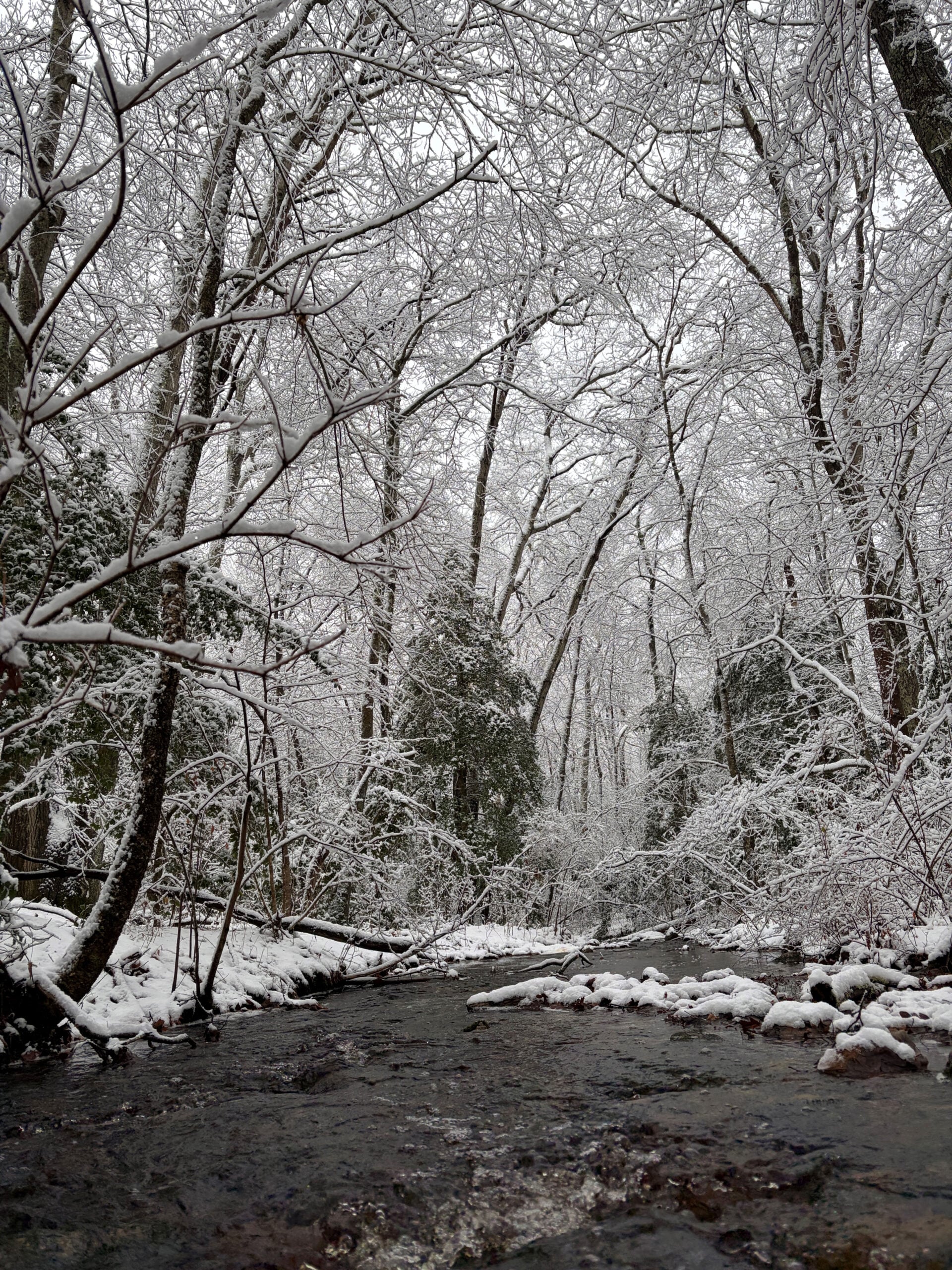 The stream meandered into the snowy woods and we found ourselves at one final road crossing before it tunneled into the brush. Here, there was a large pool, in my memory it looks to be about the size of an average in-ground swimming pool, probably smaller though. The dark water looked black against the fresh snow, and with the whole scene framed by snow-sugared branches, even at 10, I knew it was a kind of magical.