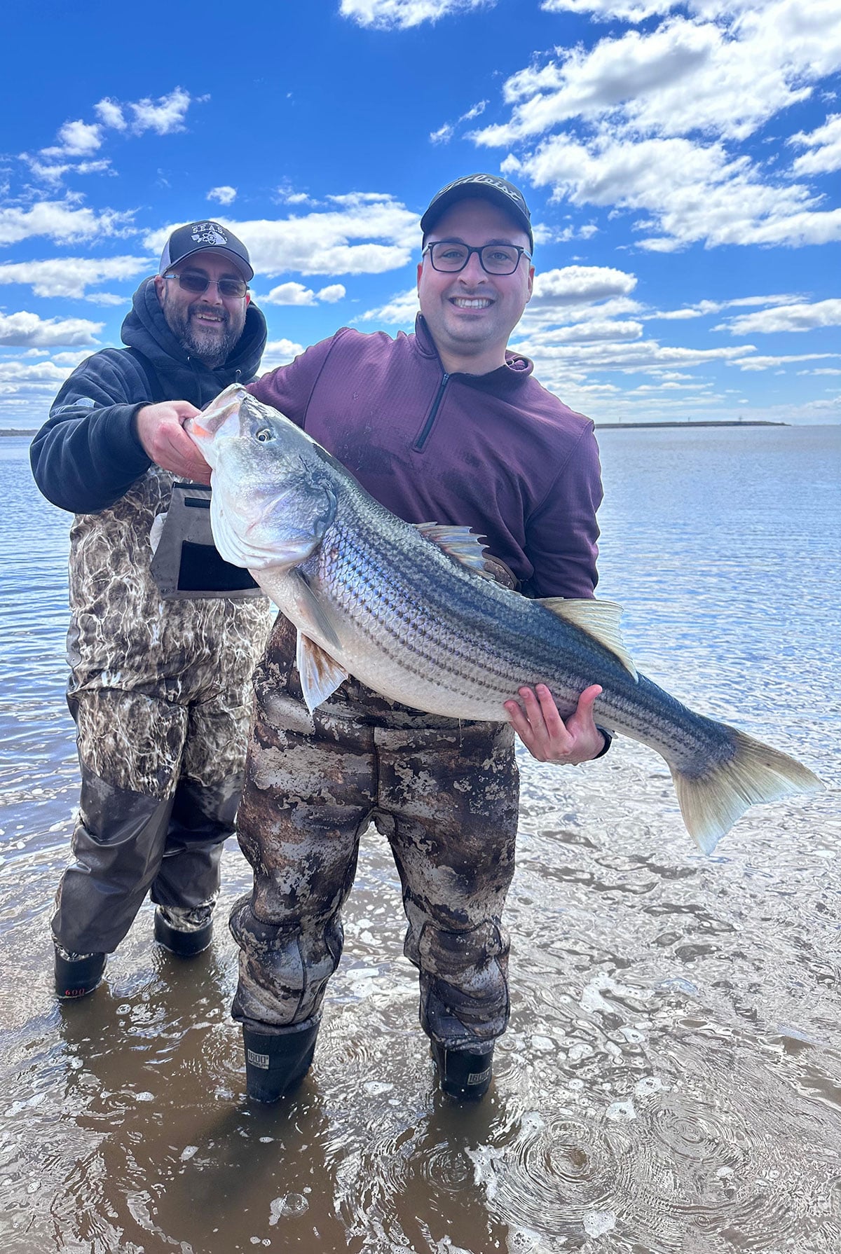 I define New Jersey’s “beginning” as the middle part of March through April, with a central focus on the last week of March and the first two weeks of April. This is the time of year when New Jersey anglers can land what I call “super-stripers”—when bass are heaviest, gorged on herring and carrying eggs for the upcoming spawn. Anglers who solely focus on “migratory” or otherwise post-spawned fish often don’t appreciate the extent to which pre-spawned fish are heavier. Bass at this time of year are literally 15 to 20 pounds heftier than later in the season. For example, at most times of the year, a 50-pounder is usually 50 or more inches, but in early spring, it’s not uncommon to see a 47-inch fish hit the 50-pound mark. One of my larger Delaware River fish of 2025 had a girth of 34.5 inches, which is over the length of what a keeper slot bass would be later in the year.