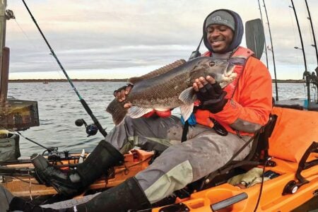 The thing that differentiates the CKC from the Dream Boat Challenge, other than the obvious kayak requirement, is that the fish are tallied in inches instead of pounds, making it possible to release any or all fish, if the angler wishes or if regulations dictate. The other thing that makes both of our tournaments unique is that there are a set number of positions in each category, so competitors can lose and gain points freely throughout the duration of the event. If you’re in first place in the blackfish category with a 24-incher and a competitor knocks you down to second with a 24.25-incher, you will lose a point! Needless to say, these point swings can have major implications on the overall scoreboard and that facet of the game can be a big part of a winning strategy.