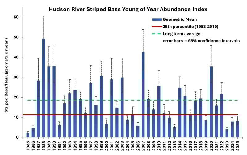 DEC surveys striped bass juveniles and adults at their spawning grounds in the Hudson River and in the Atlantic Ocean. The 2025 value for the DEC’s Hudson River striped bass young-of-year index was 8.27 fish per haul. This value is below the long-term average, and for the third consecutive year, survey values were below the 25th percentile. The index value, which provides an estimate of annual reproduction for striped bass in the Hudson River, is generated through beach seine surveys at 13 sites in the lower Hudson River conducted bi-weekly from July to November. The survey can be found on DEC’s Striped Bass webpage.