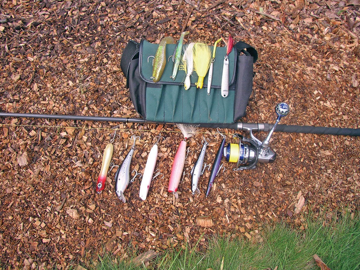 However, if it’s strictly surf and jetty fishing you’ll be doing and you’ll be using lures, I’ve found it best to use a jacket or vest with sufficient pockets to hold the terminal leaders and lures I plan to use. Towards this end I carry three or four of each favorites, including swimming plugs, poppers, block tin or stainless steel squids and bucktails. Also carry a tiny jar of pork rind (if you can find them) or other popular strip baits like Fat Cow or Otter Tails. Pre-tied leaders from home most often include teasers to entice strikes, which surprisingly often out-fish the primary lure.