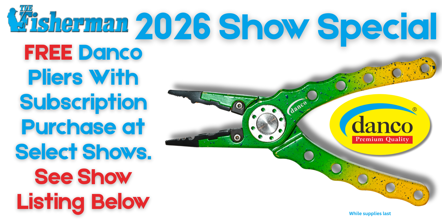 These 7-inch Fish Species pliers from Danco were designed for the everyday angler. Manufactured from T6-6061 aircraft aluminum and sporting a stainless steel spring-loaded hinge, these pliers are light, strong and in it for the long haul. Additionally, these Danco pliers feature a corrosion-resistant, anodized coating to shed the wear and tear of the salt, meaning they will hold up to the rigors of the hardcore Fisherman subscriber. The replaceable tungsten-carbide cutters effortlessly slice through braided line, fluorocarbon and monofilament, making them an essential tool. Toss them in your tackle box, stow them under the console on your boat or buy a sheath and lanyard (not included) and clip them to your belt for easy access and effortless hook removal anytime and anywhere. Find The Fisherman booth at the show nearest you, buy a new subscription or renew the one you’ve had for decades, and we will hand you a pair of these Danco Pliers, free of charge. A gift, from us to you for your continued support! We look forward to seeing you at the shows this winter, swapping stories and sending you home with a free pair of fishing pliers! Be advised, these pliers will only be available “while supplies last” and can only be obtained by signing up in person at one of the many winter shows we attend.