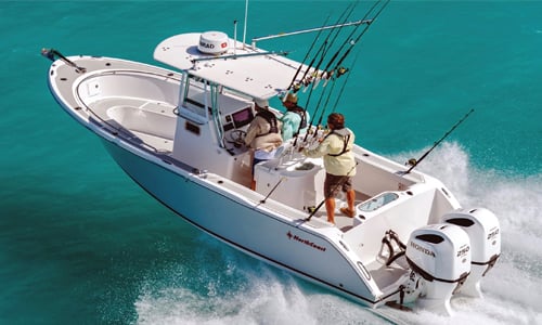 The NorthCoast 280CC features “no wood” composite construction, a standard white hull with boot stripe (with nine different added cost gelcoat color options), a foam-cored deck and molded hull liner w/two tone molded non-skid (gray/tan), a foam filled composite grid stringer system, high-density foam cored transom, a high-impact rubrail with insert and is backed by a 12-year structural hull warranty. If you want a tough as nails center console boat that can run in a rough neighborhood, this one might be your ticket to ride.